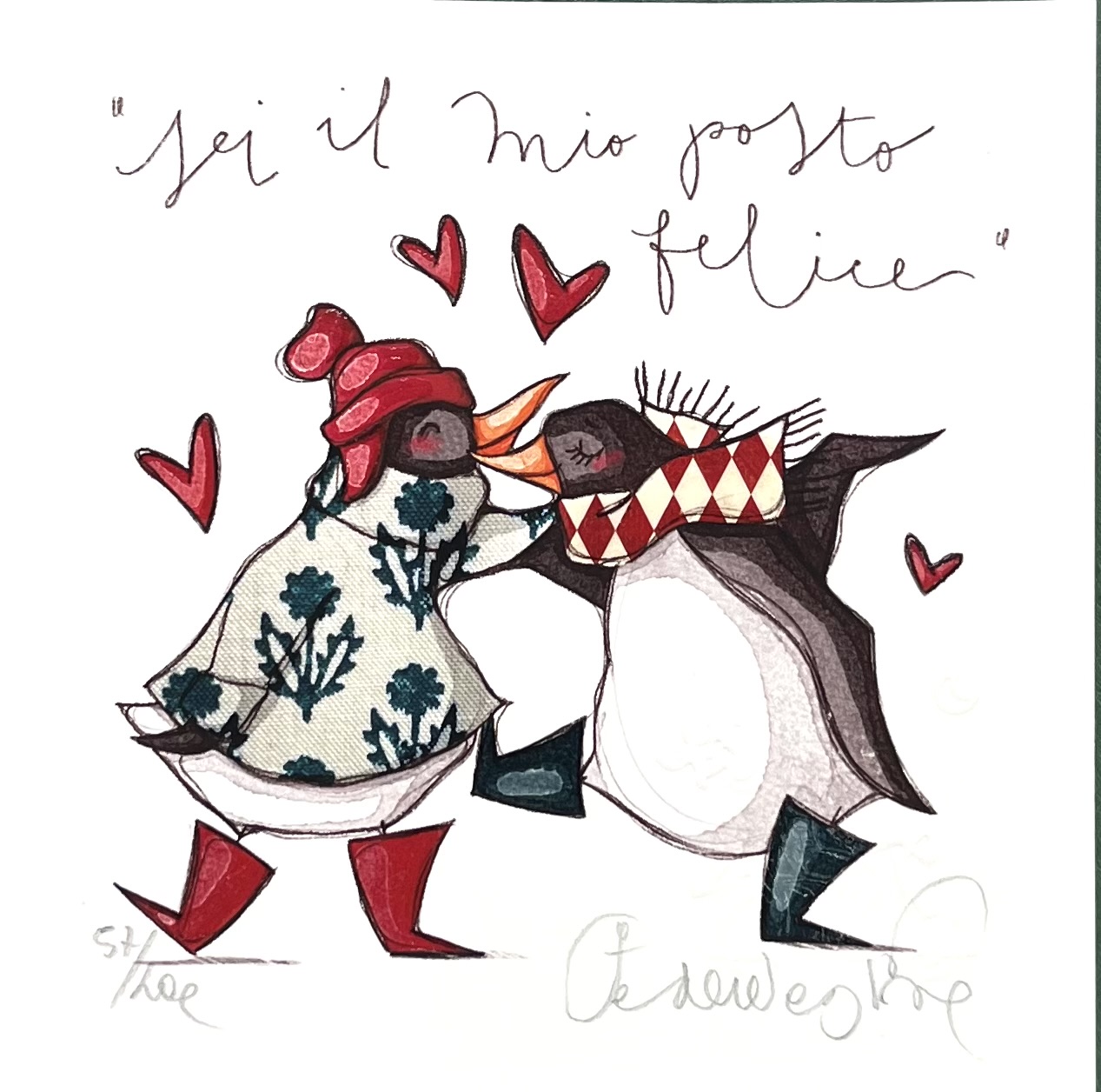 Ogni esemplare è controllato e approvato dall’autrice che numera e firma la tiratura, intervenendo su ogni singolo pezzo con un glitter o colore, un pizzo o stoffa o carte colorate, rendendo unico ogni esemplare.
