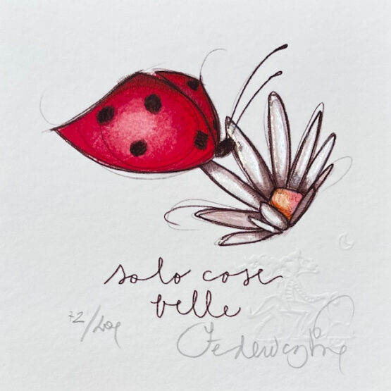 Ogni esemplare è controllato e approvato dall’autrice che numera e firma la tiratura, intervenendo su ogni singolo pezzo con un glitter o colore, un pizzo o stoffa o carte colorate, rendendo unico ogni esemplare.